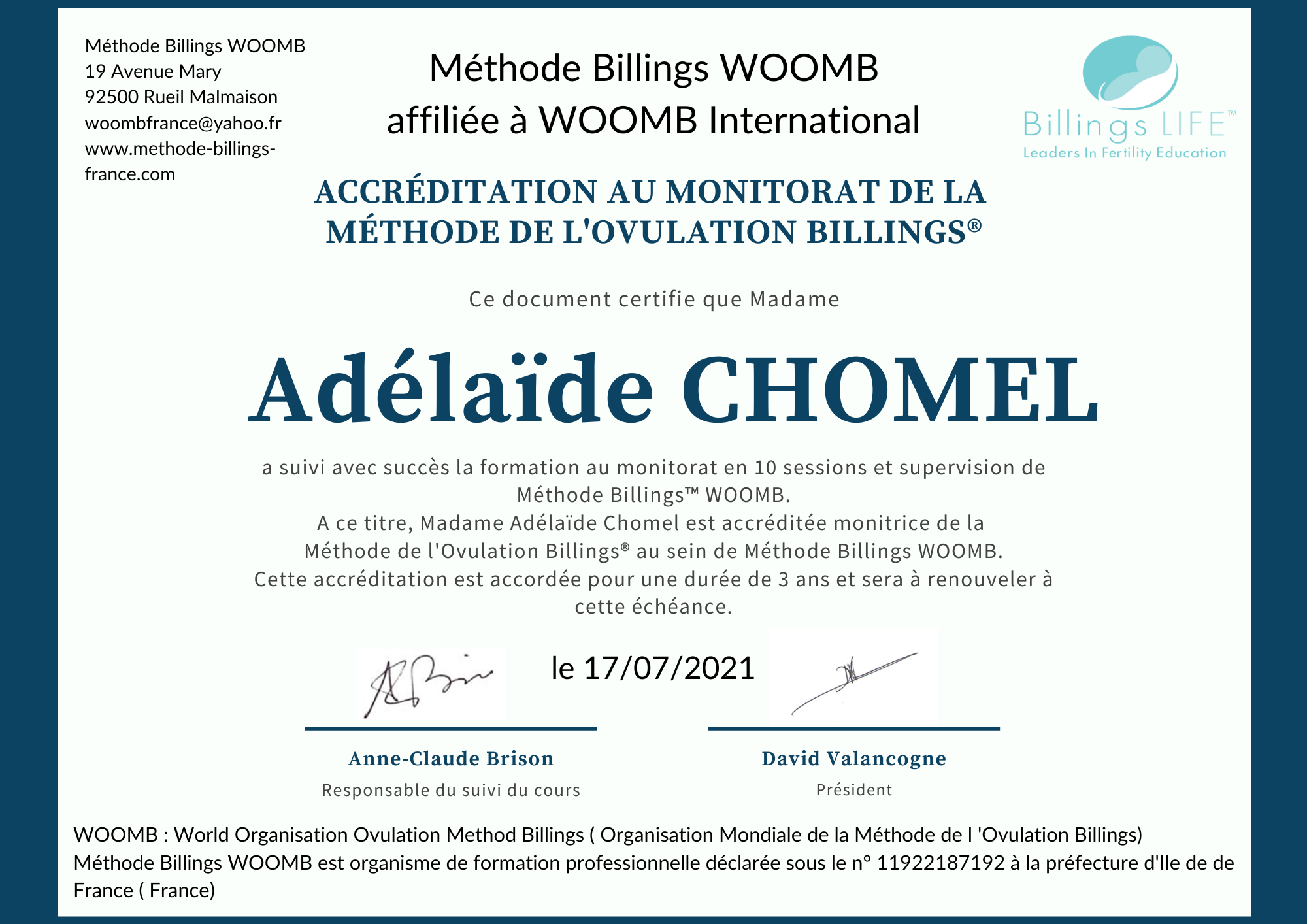 enseignante accréditée confirmée de la Méthode de l'Ovulation Billings® avec Méthode Bilings WOOMB France